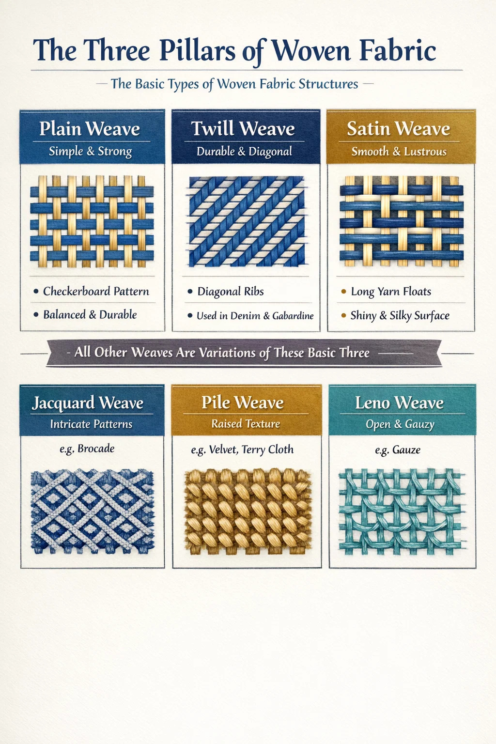 Cé go bhfuil na céadta ainmneacha margaidh sonracha le haghaidh teicstílí, tá go teicniúil trí chineál bunúsacha fabraice fite struchtúir óna dtagann beagnach gach ceann eile: Fí simplí, fite Twill, agus fíodóireacht Satin . Is modhnú casta ar na trí phatrúin bhunúsacha trasnacha seo é gach éagsúlacht eile, mar shampla Jacquard, Dobby, nó carn weaves. Tá sé ríthábhachtach na catagóirí seo a thuiscint chun marthanacht, drape agus fóntais aon táirge teicstíle a shainaithint.